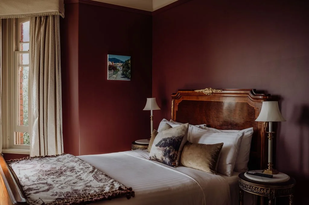 The Florence Fox Room opens onto Grande Vue’s sandstone terrace with views across the garden all the way to the River Derwent. Generously proportioned with a lounge area, The Florence Fox Room offers a comfortable and private retreat in the heart of historic Battery Point